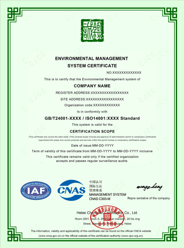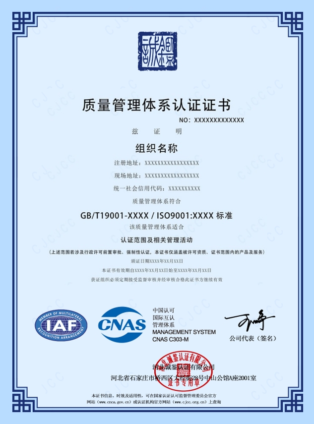 河北誠鑒認證有限公司(簡稱誠鑒認證/CJCC),創立于二零一七年,經國家認證認可監督管理委員會(CNAS)批準(批準號CNCA-R-2018-412),中國合格評定國家認可委員會(CNAS)認可(注冊號:CNAS C303-M)),是從事質量管理體系、環境管理體系、職業健康安全管理體系認證,具有獨立法人資格的第三方認證機構。